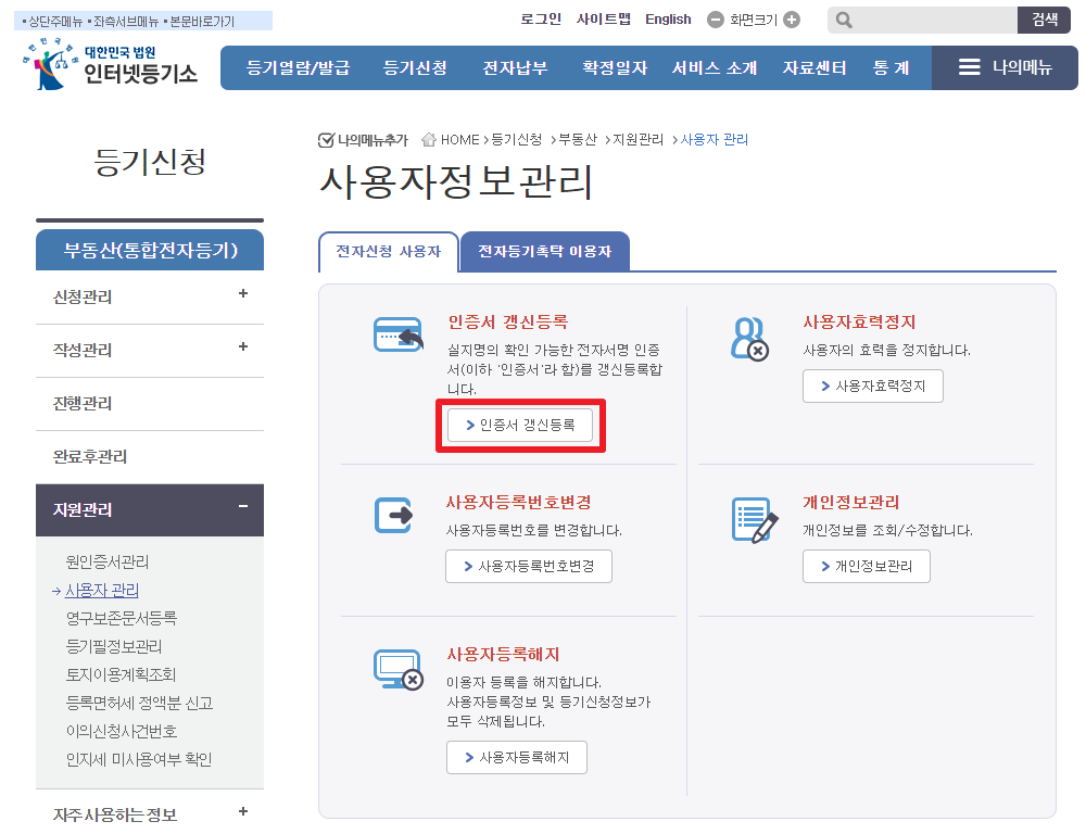 어젯밤 그 짓을 벌여놓고 아침 9시 되자마자 사용자지원센터에 전화를 걸어 문의했다. 천만다행으로, 인증서 갱신등록 메뉴가 있다. 접근번호는 처음 등록 시 단 한 번만 사용할 수 있고, 그걸 재발급 받으려면 등기소에 다시 방문해야 할 수도 있다. 다만 인증서가 바뀌거나 갱신되는 경우라면 이런 간단한 방법을 사용하면 된다.