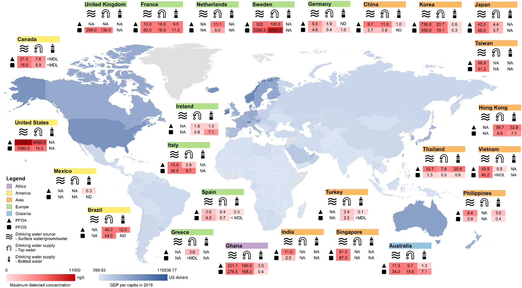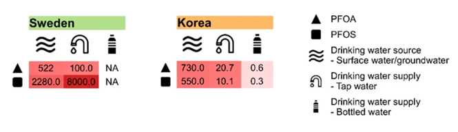 이 도표에서 언급하는 PFOA와 PFOS는 PFAS(과불화화합물)의 종류로, 식용수의 미세/나노플라스틱 오염을 측정하는 지표 물질이다.